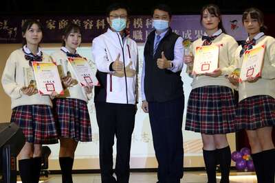 本年度榮獲「全國高中職家事類技藝競賽」美顏與美髮選手蕭書涵、蔡昀珊、許菱容、吳權恩,獲選全國美顏職種競賽第2名,以及3座美顏美髮的優勝成績,亮眼表現也在本次成果展進行獻獎。選手蕭書涵同學回想起訓練過程直呼「血淚交加」,不間斷練習外,遇到瓶頸時找教練指點迷津,還有一群戰友互相支持,才能再突破再重新出發。蔡昀珊同學也表示,除了學科加強之外,要想在技能操作上進步,要充分蒐集資料,很多英文資料剛開始要靠翻譯軟體,後來發現很多專業詞彙重複出現,最後一看就懂,「唸出英文」就要學習發音,反覆多唸幾次,記憶會更深刻,英語力就在無形中提升了。
