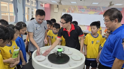 此次整建內容豐富多元,包括規劃「天文八大行星步道」,讓學生能透過實地走訪感受太陽系奧秘;新設「科學教育中心」與「科學展示櫃」,展示多樣化的自然科學教具,提升學生學習興趣。教室內則全面更新桌椅,增設洗手台、軌道燈,並設置「科學互動牆」,提供更多動手操作與探索的機會。更令人期待的是,校園新增了「大型槓桿」與「大型滑輪組」體驗設施,透過自然老師吳萬益、黃馨瑩和吳振佑老師的課程設計,進行現場實驗展示,二重的學生實際坐進箱子中,現場透過滑輪組被可垂直省力拉高,親身體驗物理原理的趣味與奧妙。這些設施不僅強化課程教學,也讓科學走入生活,培養孩子動手實作與探索精神。