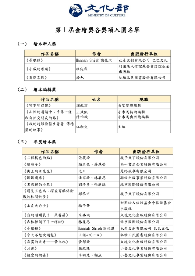 第1屆金繪獎各獎項入圍名單已於115年1月26日公布,相關名單及資料表如附件,提供各校、幼兒園、公共圖書館及相關單位選購與閱讀推廣之參考。