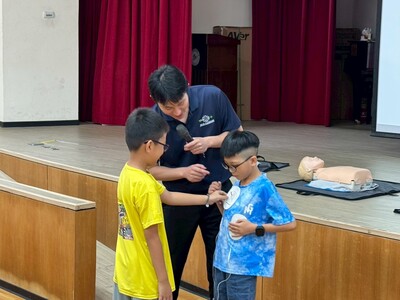 課程邀請新北市消防局高級救護員邱治強教官擔任講師,運用深入淺出的情境模擬與互動教學,讓孩童輕鬆學會「叫叫CD」記憶口訣(叫叫=叫人、叫119,C=胸外按壓,D=電擊去顫器),並透過實際練習AED貼片與語音操作,提高應變與判斷能力。邱教官表示,急救教育應從小扎根,雖然國小學童體能有限,難以獨立完成胸外按壓,完整執行CPR步驟,但若能建立正確觀念與流程記憶,就能在關鍵時刻發揮協助作用,搶救寶貴生命。