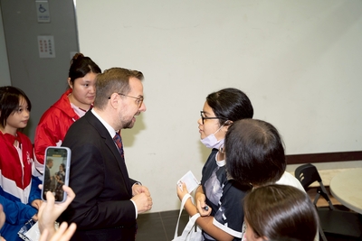 史坦格代表以幽默、生動的方式介紹捷克的歷史、文化及生活日常,從美麗的布拉格街景到著名的捷克音樂與建築藝術,皆以親切的語調娓娓道來。他也分享在台灣擔任駐台代表的生活經驗,並提到捷克與台灣雖地理距離遙遠,但人民之間的友善與重視教育的精神,讓兩地有著驚人的共通點。他表示,非常高興能與這麼多熱情的學生面對面交流,希望藉由今天的分享,讓同學對捷克有更深刻的認識,也激發他們對國際文化與外交事務的興趣。校長許淑貞表示,這次活動是一場難得的國際文化饗宴,不僅讓學生增進英語聽力與口說的實際應用,也在互動中開拓了他們的世界觀。學校長期重視國際教育與多元文化學習,未來將持續規劃更多與外國友人面對面交流的機會,讓學生在校園裡就能接軌世界,勇敢追夢、放眼國際。