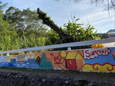 - 【新北市訊】新北市立平溪國中在學期結束前夕,結合服務學習,徵選對繪畫有興趣的學生,在台灣文化藝術公益協會胡復金理事長的帶領下,將原本佈滿青苔、潮濕頹敗的環山坡道圍牆,進行創意彩繪。雖然天氣炎熱,但是學生戴斗笠揮灑彩筆的容顏,與逐漸清新亮麗的圍牆,融合成為一幅完美的畫面,整個校園煥然一新,更顯活潑朝氣。