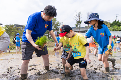 活動當天,四校的孩子們赤腳踏入這片「八里最後的水田」,在老師與社區耆老的引導下,學習如何正確握住秧苗並紮根於泥土中,孩子們親手將翠綠的秧苗植入大地,透過指尖的觸感,真實感受農耕的辛勞與喜悅